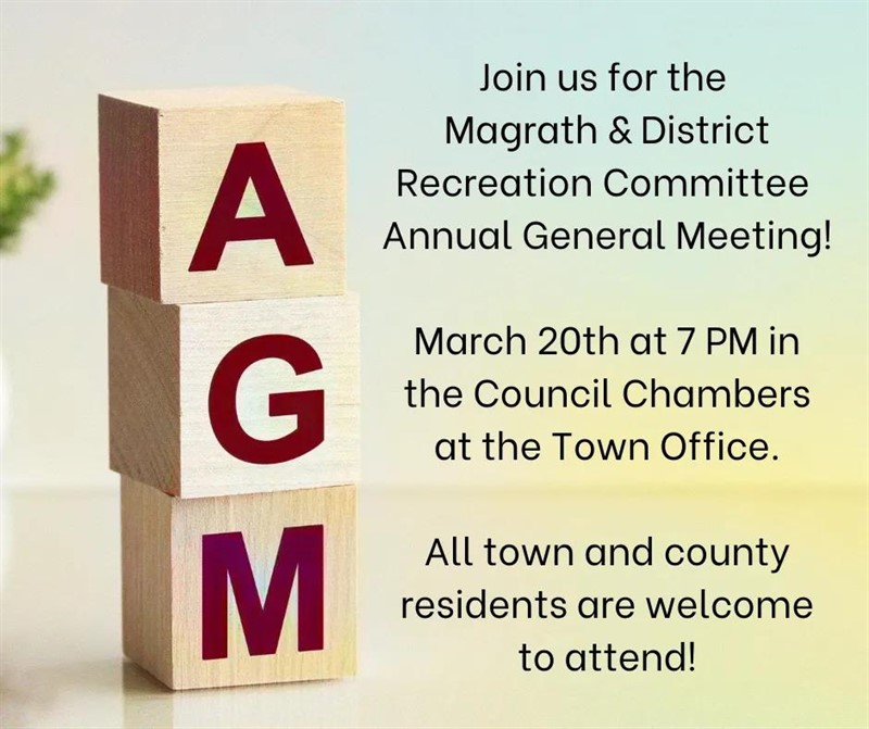 Magrath Recreation Committee AGM Thursday, January 9, 2025 March 20 at 7 pm in the Town Hall Council Chambers.