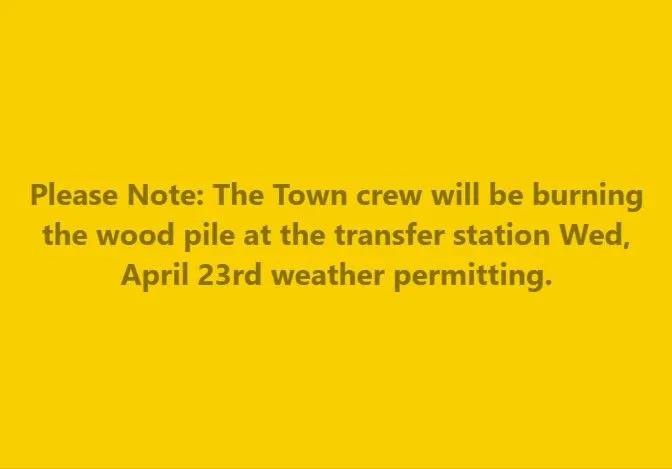 Burning of wood pile - April 23 Tuesday, April 22, 2025 The Town crew will be burning the woodpile @ the transfer station on Wednesday, April 23, weather permitting.