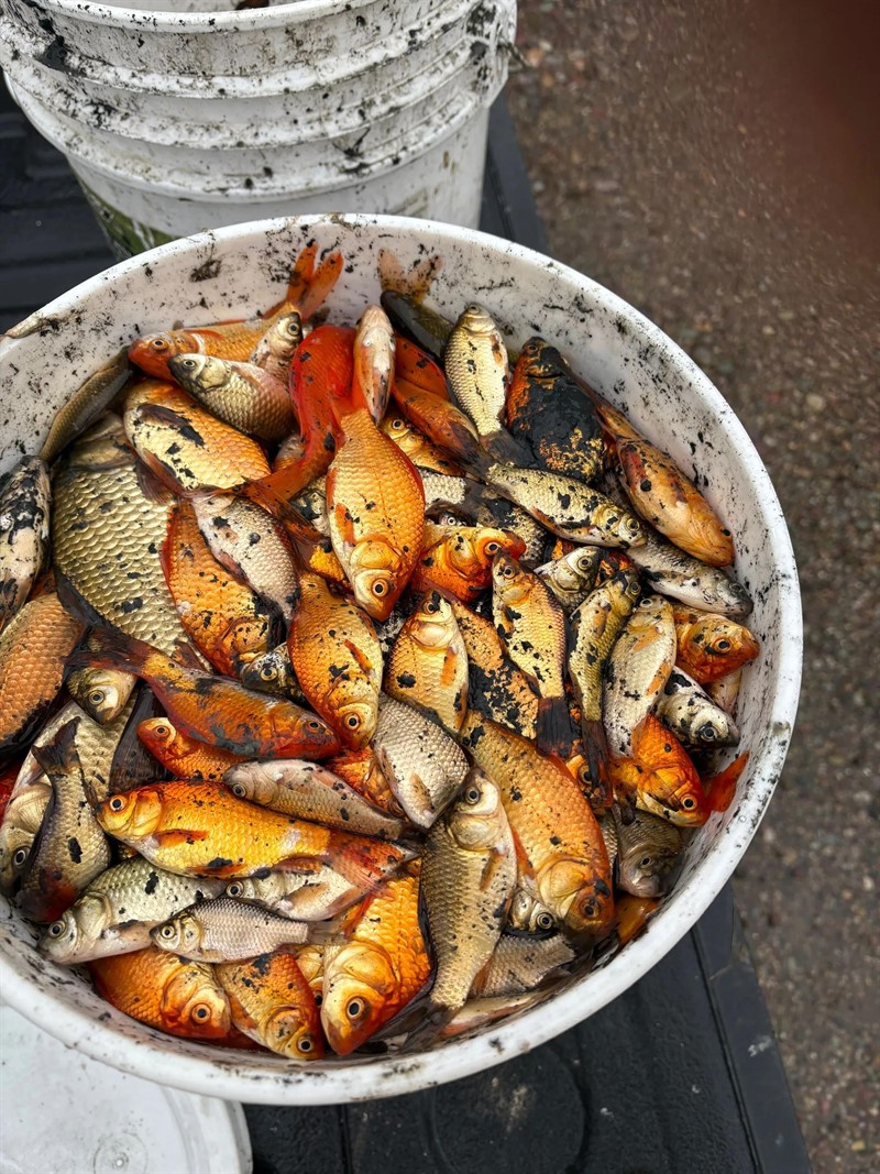 The Town has been hard at work tackling the invasive goldfish in our storm water pond, and we’ve made real progress! Over the past 3 days, in the first of 2 pesticide applications that will be performed, the Town’s staff have removed more than 64,000 (and counting!) goldfish totalling 570kg.