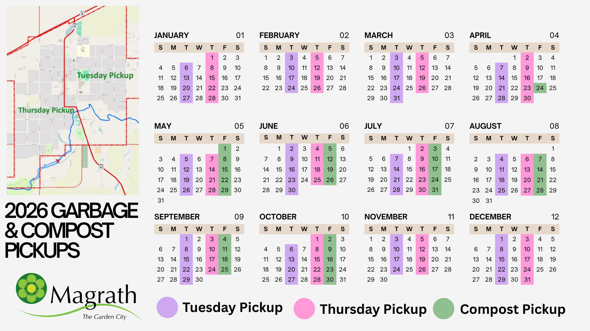 The Town of Magrath will collect waste weekly according to the following schedule: